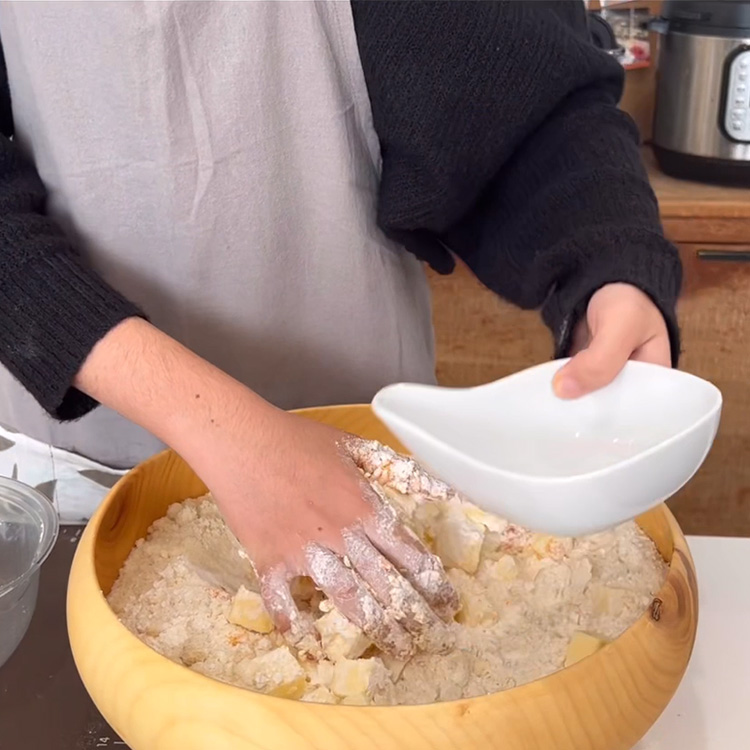 ①全ての材料をひとまとまりになるまで強く手でこねる