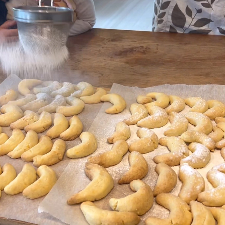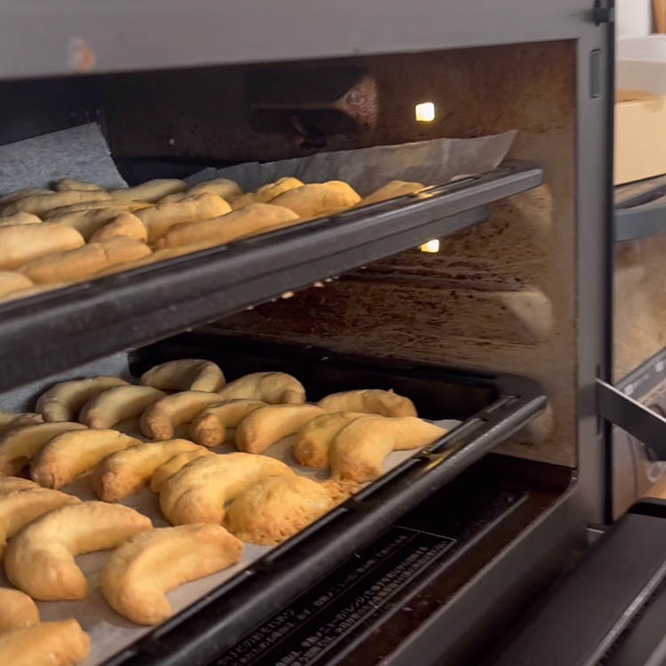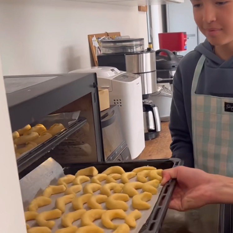 ⑤成型した三日月生地をオーブンシートを敷いた天板に並べて、10~12分焼く